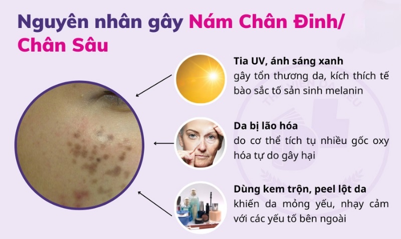Ngoài ra, việc sử dụng mỹ phẩm không phù hợp như kem trộn hoặc peel da mạnh có thể làm mỏng và yếu da, khiến da dễ bị tác động bởi môi trường. Kết hợp với các yếu tố như căng thẳng kéo dài hoặc di truyền, nám chân sâu thường có xu hướng dai dẳng và khó cải thiện nếu không chăm sóc đúng cách.