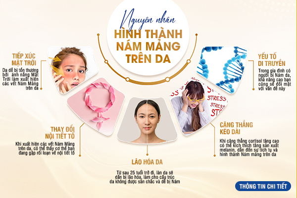 Bên cạnh đó, sự thay đổi nội tiết tố cũng là yếu tố quan trọng khiến nám mảng xuất hiện, đặc biệt ở phụ nữ sau 25 tuổi, sau sinh hoặc trong giai đoạn rối loạn hormone. Khi nội tiết không ổn định, hoạt động của tế bào sắc tố bị kích thích, khiến da dễ xuất hiện các vùng tăng sắc tố rõ rệt.