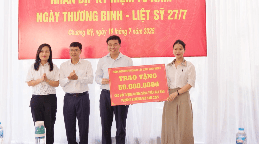 Nhân dịp kỷ niệm 78 năm Ngày Thương binh Liệt sĩ 27/7, Đảng ủy - HĐND - UBND phường Chương Mỹ đã tổ chức chương trình từ thiện ý nghĩa với sự đồng hành của Phòng Khám Chuyên Khoa Da Liễu Elmer Quyên Nguyễn. Diễn ra ngày 19/07/2025, sự kiện không chỉ tri ân những anh hùng liệt sĩ mà còn lan tỏa tinh thần đoàn kết, sẻ chia trong cộng đồng.